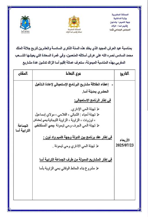 اعلان إعطاء الانطلاقة لعدد من المشاريع التنموية المهمة بالجماعة الحضرية لآسا