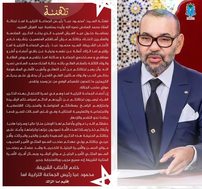 تهنئة السيد: "محمود عبا" رئيس الجماعة الترابية اسا، لجلالة الملك محمد السادس نصره الله وأيده بمناسبة عيد العرش المجيد.