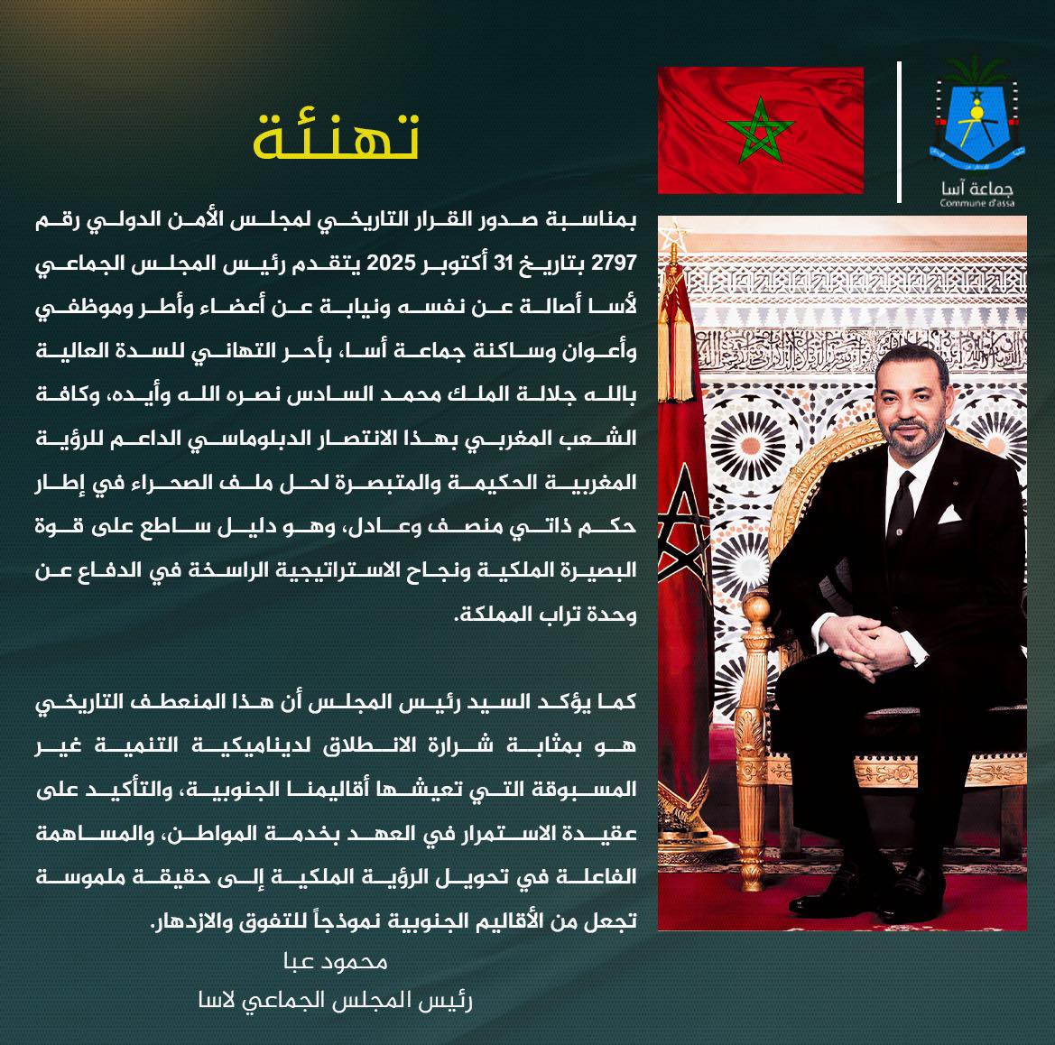 تهنئة لجلالة الملك محمد السادس بمناسبة صدور قرار مجلس الأمن الذي يتبنى مقترح الحكم الذاتي للأقاليم الجنوبية للمملكة تحت السيادة المغربية